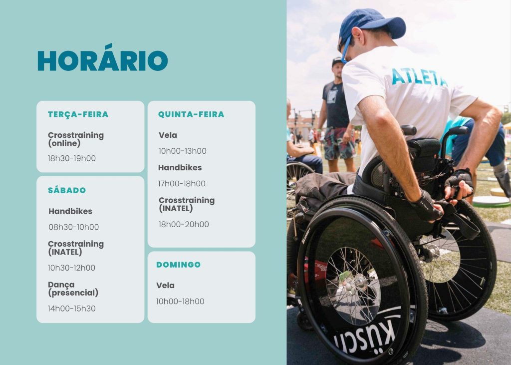 Com o apoio da Associação Salvador, os participantes do projeto Desporto podem integrar modalidades como dança, vela, ginásio presencial, handbikes e crosstraining online. Dividindo-se entre treinos online e presenciais, de modo a chegar a um maior número de participantes, o calendário atual contempla vários dias da semana, e horários.