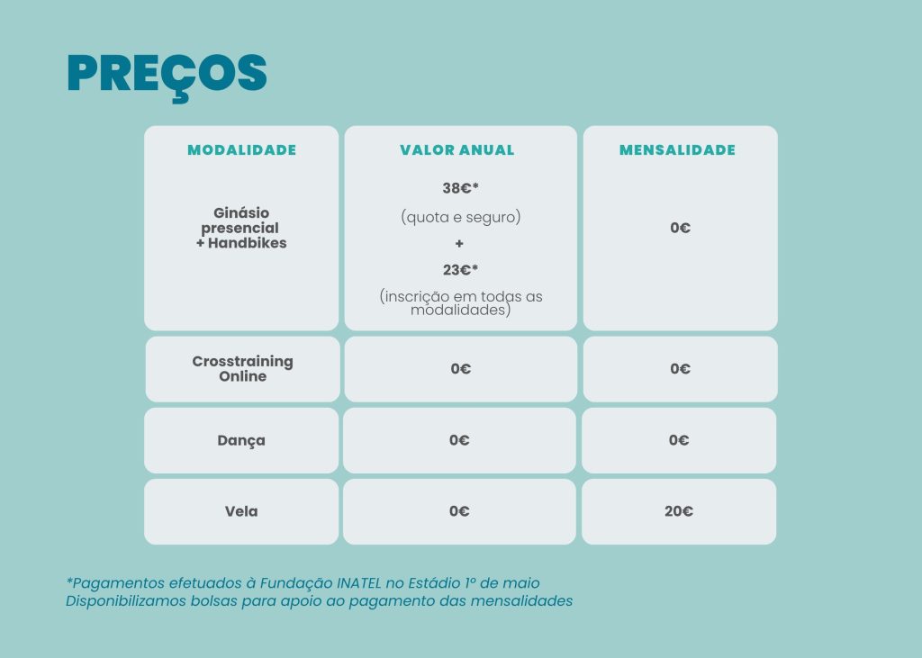 NOTA IMPORTANTE: Para frequentar qualquer modalidade desportiva é necessário ter a quota do cartão família em dia (30€/ ano – mínimo).