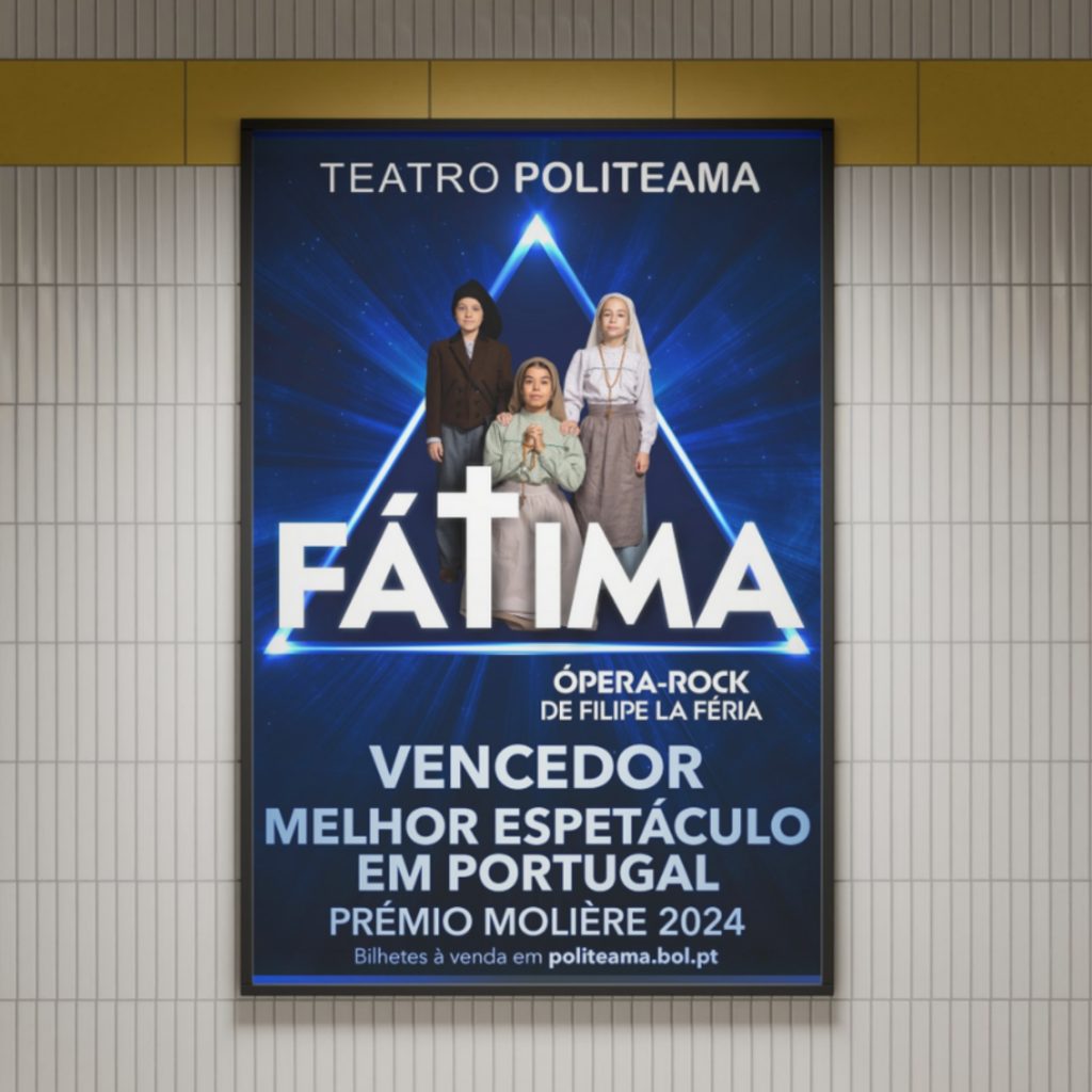 “Fátima” é uma original Ópera-Rock portuguesa que revisita o fenómeno de Fátima numa versão contemporânea, narrando os acontecimentos de 1917 na Cova da Iria – um dos episódios mais marcantes do século XX português. A produção combina o rigor histórico com uma galeria de personagens humanas e surpreendentes, oferecendo uma reflexão profunda sobre Portugal e a sua história. A peça está em cena desde 18 de setembro e continua até 28 de setembro.